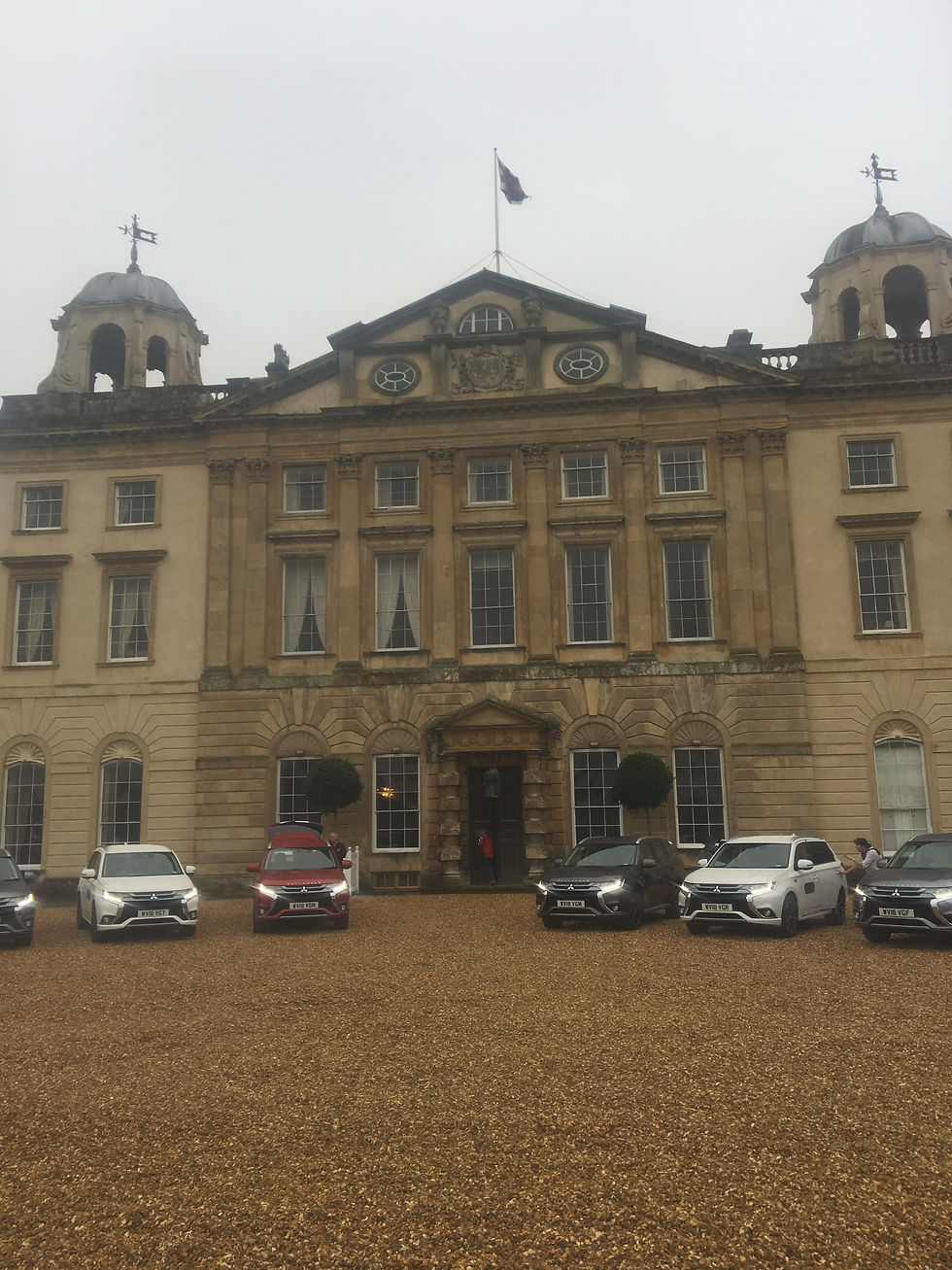 Fleet of Mitsubishi Outlanders outside Badminton House on a rather grey and drizzly looking day.